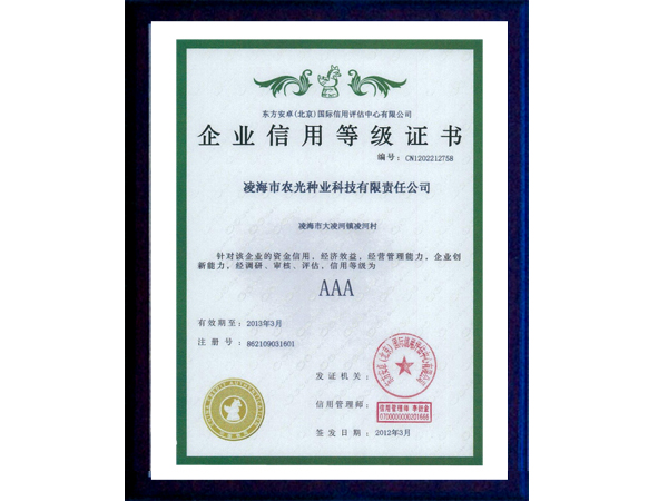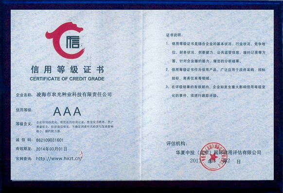|   凌海市農光種業科技有限責任公司是由遼寧省種子管理局和凌海市人民政府批準,集科研、生產、試驗示范、經營為一體的種子企業。 公司擁有種子繁育基地3萬畝,年產種子1200萬公斤左右。自成立以來在農業部及遼寧省歷次花期檢驗中,所生產的種子質量合格,擁有良好的儲備、晾曬和機械加工設備,為了提高種子質量,2015年新購置種子脫粒機、清選機、烘干機以及電腦包裝機等整套加工設備,擁有經省技術監(jiān)督局認證的“標準化檢驗室”,投資20萬元購買人工氣候室、土壤測試儀、低溫低濕冷藏箱等各種檢驗設備。公司重視種子科研工作,現有科研育種實驗基地100畝,科研上以自主研發(fā)為主,同時與多家科研單位合作育種,每年繁、育、測交材料2000多份,現以推出五個組合參加錦州區域試種,其中“農光3號、農光4號”在錦州地區試驗中產量居首位。2006年公司買斷的連玉16玉米品種已通過5個省市的審認定,具有適應性廣、抗逆性強、產量高的特點,曾榮獲大連科技進步一等獎,深受廣大農戶的歡迎。2008年公司新選育的農光4000玉米品種在市種子管理站新品種大區試驗項目中。2012年公司買斷錦玉118品種權,新品種的推廣與應用為公司的發(fā)展提供了充足的動力......  |